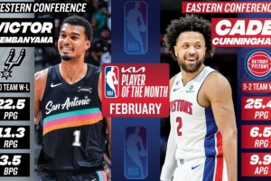 体育资讯3月4日讯 今日NBA官方宣布,马刺球星文班亚马和活塞球星坎宁安分别被评为西部和东部二月份最佳球员。