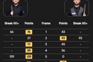 马克·艾伦打出一杆破百(39)和一杆50+(66),乔·奥康纳打出一杆50+(93),上半场结束艾伦3-1领先奥康纳,最终马克·艾伦5-2战胜乔·奥康纳晋级半决赛。