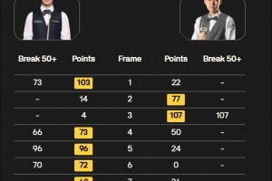 上半场两人2-2战平,下半场韦克林找回手感连胜四局,6-2领先常冰玉结束第一阶段。